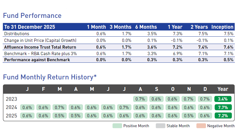 The Affluence Income Trust has continued to perform well, providing investors consistent distributions paid monthly. For 2025, the Fund delivered returns of 7.2% compared to the benchmark of 6.9%.