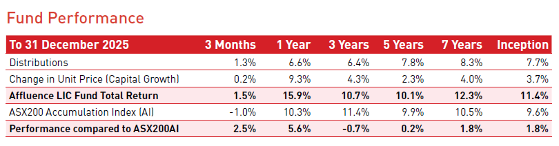 In 2025 the Affluence LIC Fund returned 15.9%, significantly outperforming the ASX200 Index of 10.3%. It’s a pleasing result, given the portfolio discount to NTA at 31 December 2025 remained high at 27%.