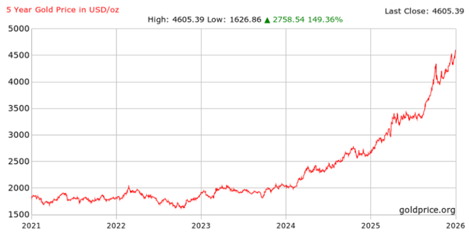 The gold price rallied hard in 2025, continually hitting new all time highs. Prices have increased due to strong “safe haven” demand amid global economic uncertainty, geopolitical tensions (like trade wars and conflicts), high inflation, and significant buying by central banks diversifying away from the US dollar. This has created ideal conditions for its traditional role as a store of value, with lower interest rates making non-yielding gold more attractive. The increase in the gold price has translated into phenomenal gains for some gold miners.