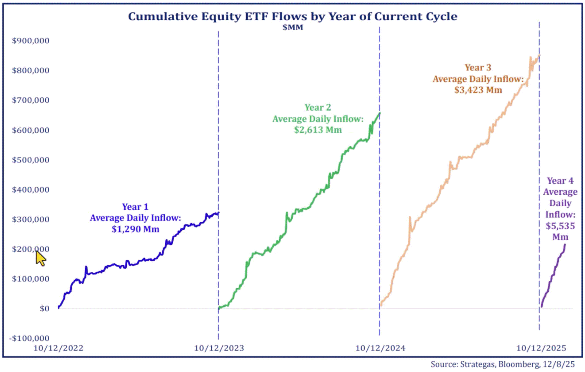Inflows into ETFs have risen incredibly fast during the past few years, as this chart shows.