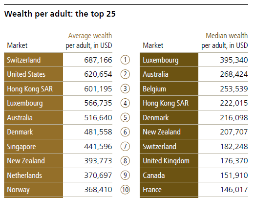 Whether it’s average wealth, or median wealth, Australia continues to be one of the top 5 in the world when it comes to wealth per adult, based on this UBS data from 56 countries: