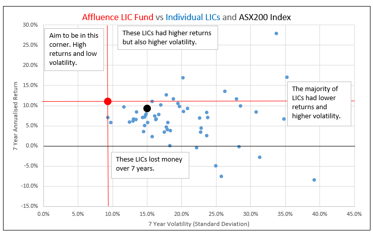 Convincing investors to part with their money for LICs right now is hard. That tells us there is significant value to be had, and our work confirms this. The Affluence LIC Fund has delivered over 11% per annum since inception. Around half that return has come from our discount capture skill – essentially buying individual LICs when they are trading at unnaturally large discounts and selling when they normalise. Because of this, we’ve outperformed the vast majority of individual LICs over the past 7 years, with significantly fewer ups and downs.