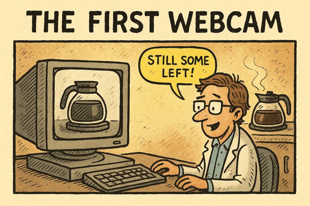 * In 1991, a group of scientists at the University of Cambridge Computer Lab were facing a critical productivity crisis – walking all the way to the coffee room only to find the pot empty! So, a few engineers wired up a camera pointed at the communal coffee pot and wrote code to stream the live feed directly to their desktops. Thus, the first webcam was born. Not to change the world. But to avoid the horror of zero coffee.
