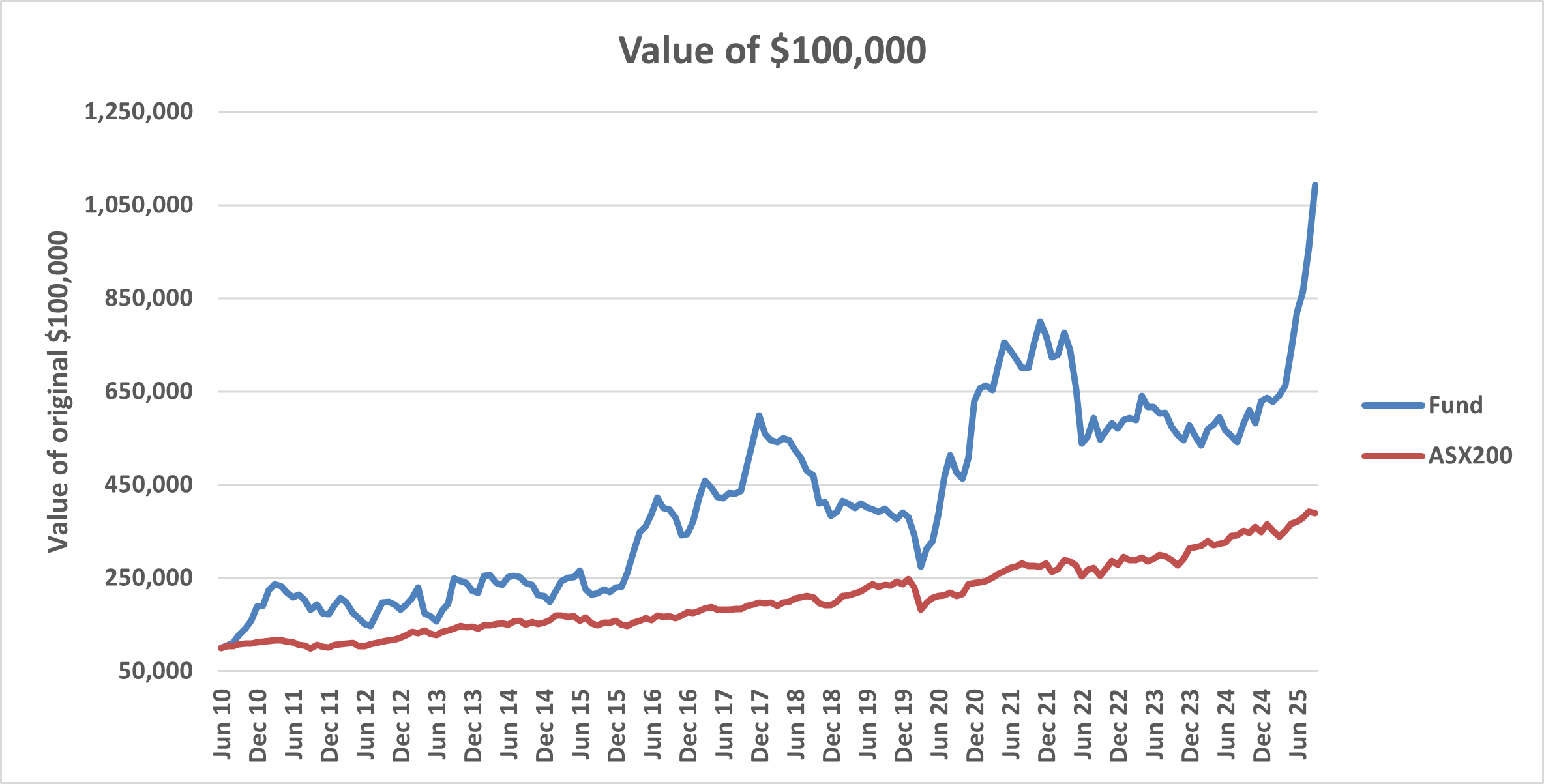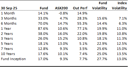Recent performance has been exceptional, which has the effect of also improving the longer-term numbers. The price to pay for such high performance in a niche asset class is high variability of returns (volatility). Volatility has been 28% for the Fund since inception. For comparison, the ASX 200 volatility for the same period has been 13%. This is clearly shown by the graph above.